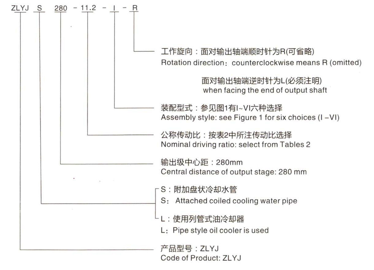 齒輪箱的代號中,包括型號、輸出級中心距、公稱傳動比、裝配型式以及輸出軸工作旋向。