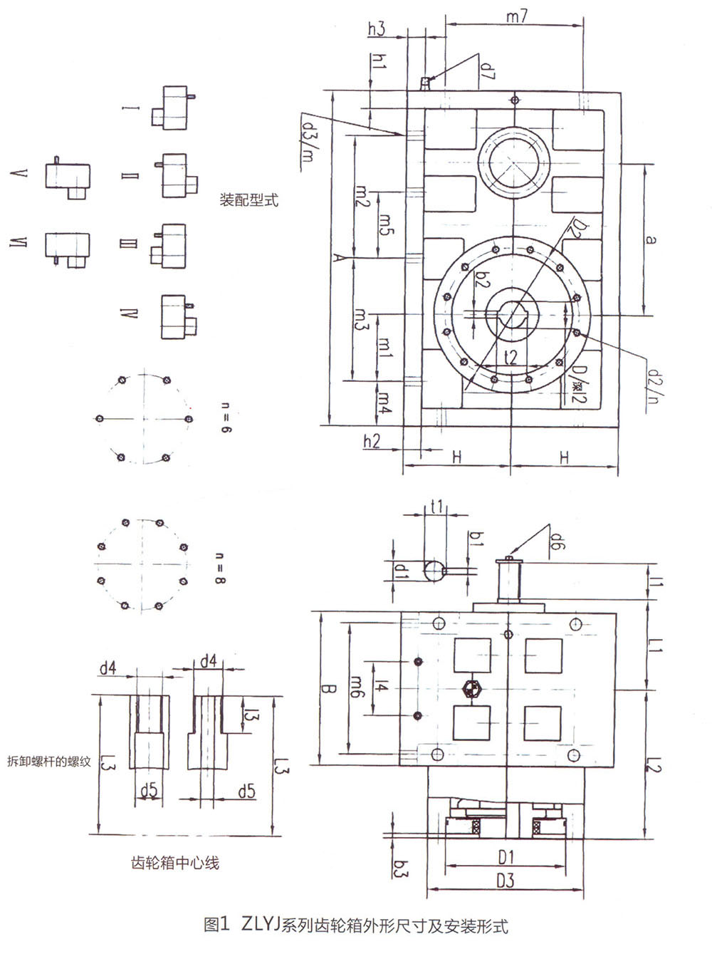 ZLYJ系列齒輪箱的外形、安裝尺寸見圖1、表1。