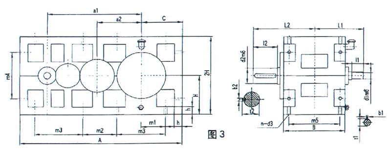 齒輪箱的外形、組合型式見圖3、圖4,規格尺寸見表6。
